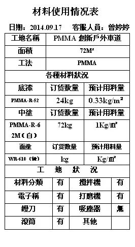 中涂施作中:主剂PMMA-R-62M(白)12KG加入固化剂0.1KG进项均匀搅拌,其比例就是120:1,其用料量在1KG/㎡