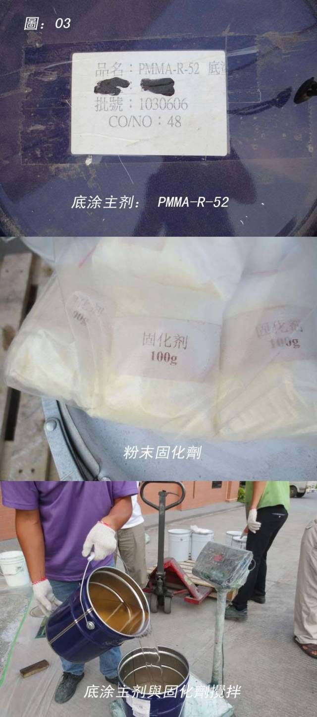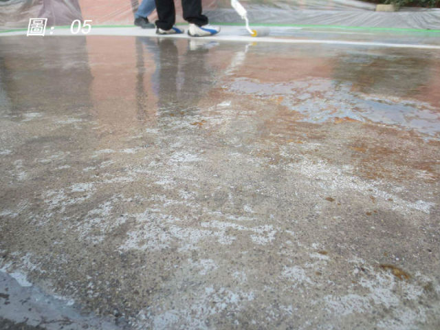 底涂施作完局部修补:其材料胶化时间及固化时间特别快,刚施作完15分钟左右的地面就可以踩上去做局部修补了,可见固化时间特别的快。(如圖06)