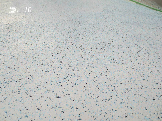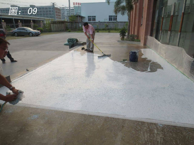 施作中涂时:边施作边喷岩片,喷岩片速度要快,材料固化时间很快,这样就可作出花样的地坪,比较美观。(如圖09)