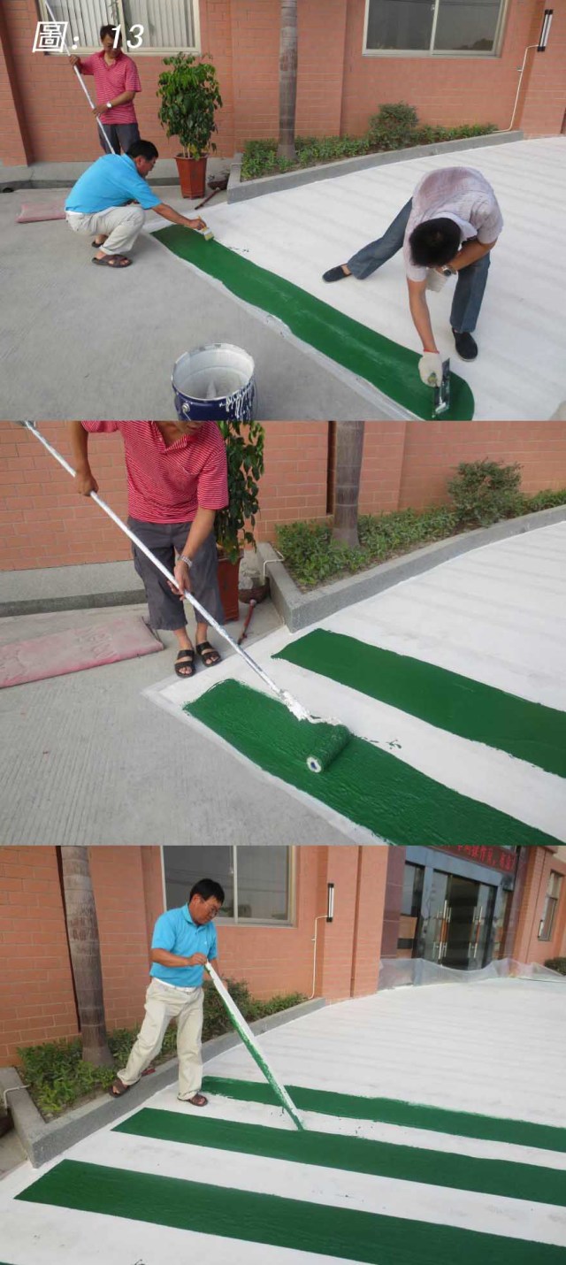 绿色面涂施作出车道的图形,先用美纹胶带贴出条纹的图案,再把材料WR-610(绿)施作在图案内,施作完后再用滚筒压出花纹来,压花完后就撕胶带,这一过程起码要三个人员一起施作,其固化速度真的很快。(如圖13)