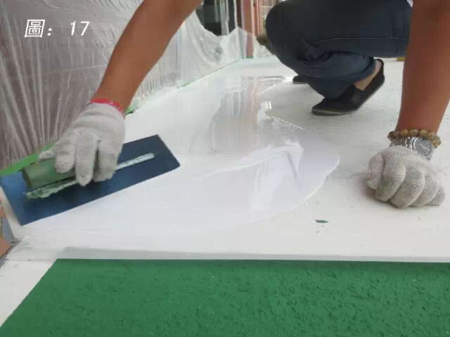 施作工具:由于用料量要一次性施作1KG/㎡,胶化速度快,施作的速度就得快,因此有的施工人员会直接用耙子施作比较快,老练的施工员也可以用镘刀施作。但是如果在通风情况不好的地方施作,**不要蹲着用镘刀施作,气味比较重,对身体无益。(如圖08)
